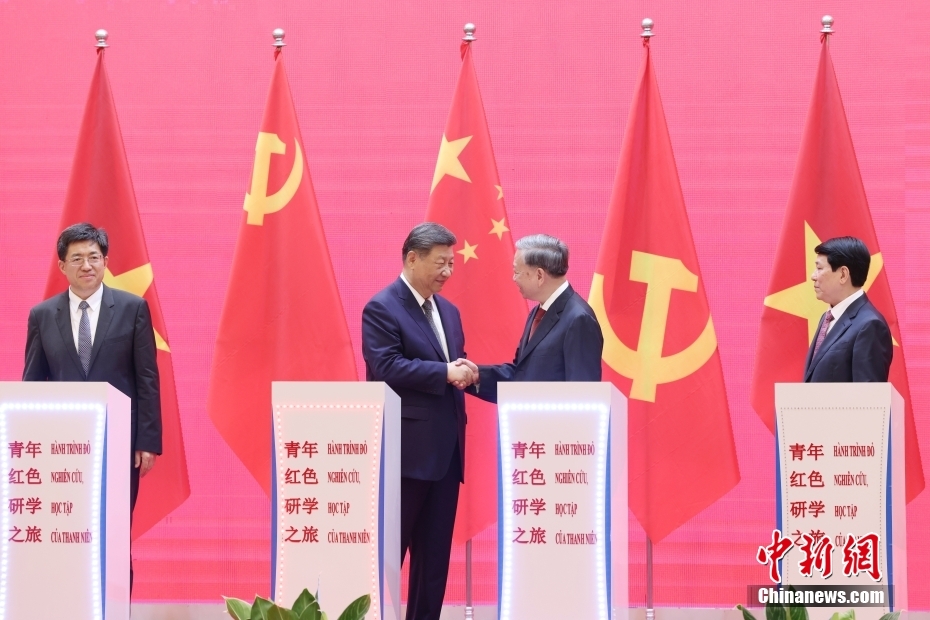 当地时间4月15日,中共中央总书记、国家主席习近平在河内和越共中央总书记苏林等共同启动“红色研学之旅”项目。中新社记者 盛佳鹏 摄