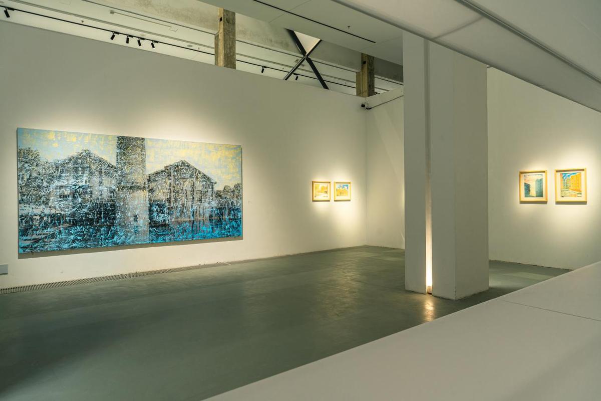 在B1层展出的,皆为宿利群以陶溪川标志性建筑为主题创作的大尺幅新作:将放大的黑白影像作品附着在油画布上后,使用各种颜料和手法进行覆盖。与之对照展出的是,宿利群于2019年在陶溪川完成的一组小尺幅水墨作品。