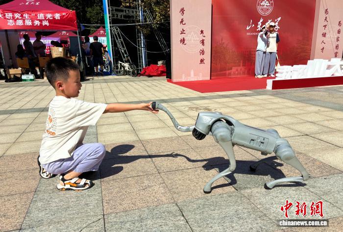9月2日,山东济南,一名小朋友在山东大学迎新现场和四足机器人握手。高艺芯 摄