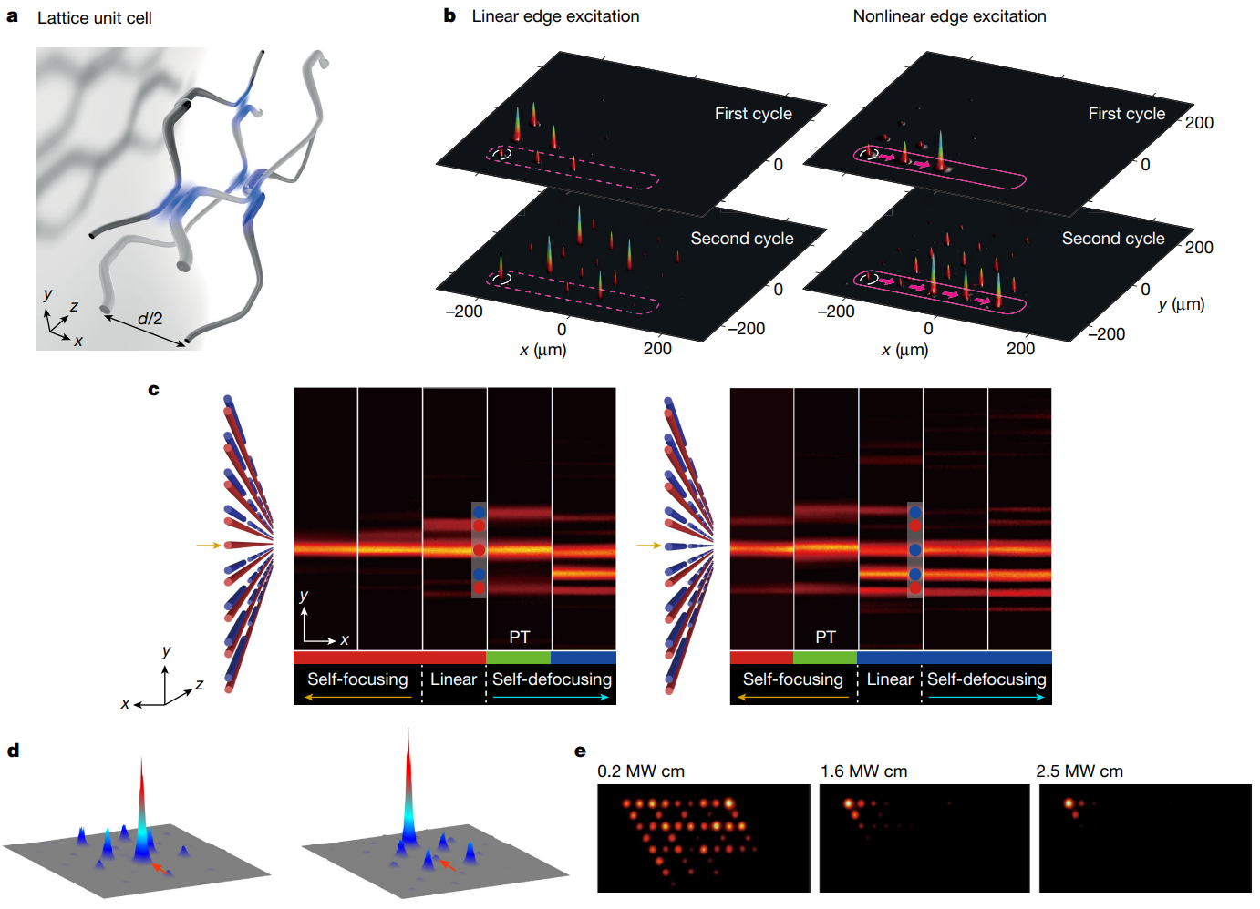 图3. 非线性拓扑结构。(a)二维非线性光学拓扑绝缘体,其非线性是基于具有失谐折射率的耦合光波导予以实现。(b)在低功率状态下,光衍射到晶格内部;对于高输入功率值,系统发生拓扑相变,变成拓扑非平庸相,出现手性边界通道。(c)基于耦合光波导的非厄米拓扑SSH模型,其中非线性控制系统的增益和损耗,使其在PT对称和非PT对称状态之间切换,并伴随着具有增益(左)和损耗(右)界面的拓扑零能模式的破坏和恢复。(d)沿Floquet 拓扑绝缘体的边缘形成的光孤子波。(e)在二阶拓扑绝缘体的拐角处形成非线性引起的角态。