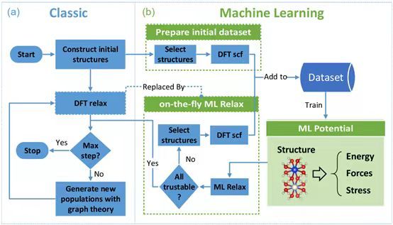 图1:(a)传统结构搜索流程 (b)加入了机器学习力场后的结构搜索流程。