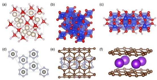 图3:MAGUS的一些代表性成果。(a) 巨行星内部的氦-水化合物 ; (b) 二氧化硅混合配位高压相; (c) 二氧化硅-水化合物 ; (d) 超硬的WN6化合物; (e) 碳纳米管中的氮纳米管 (f) 可剥离出层状超导T-graphene的C4K化合物。