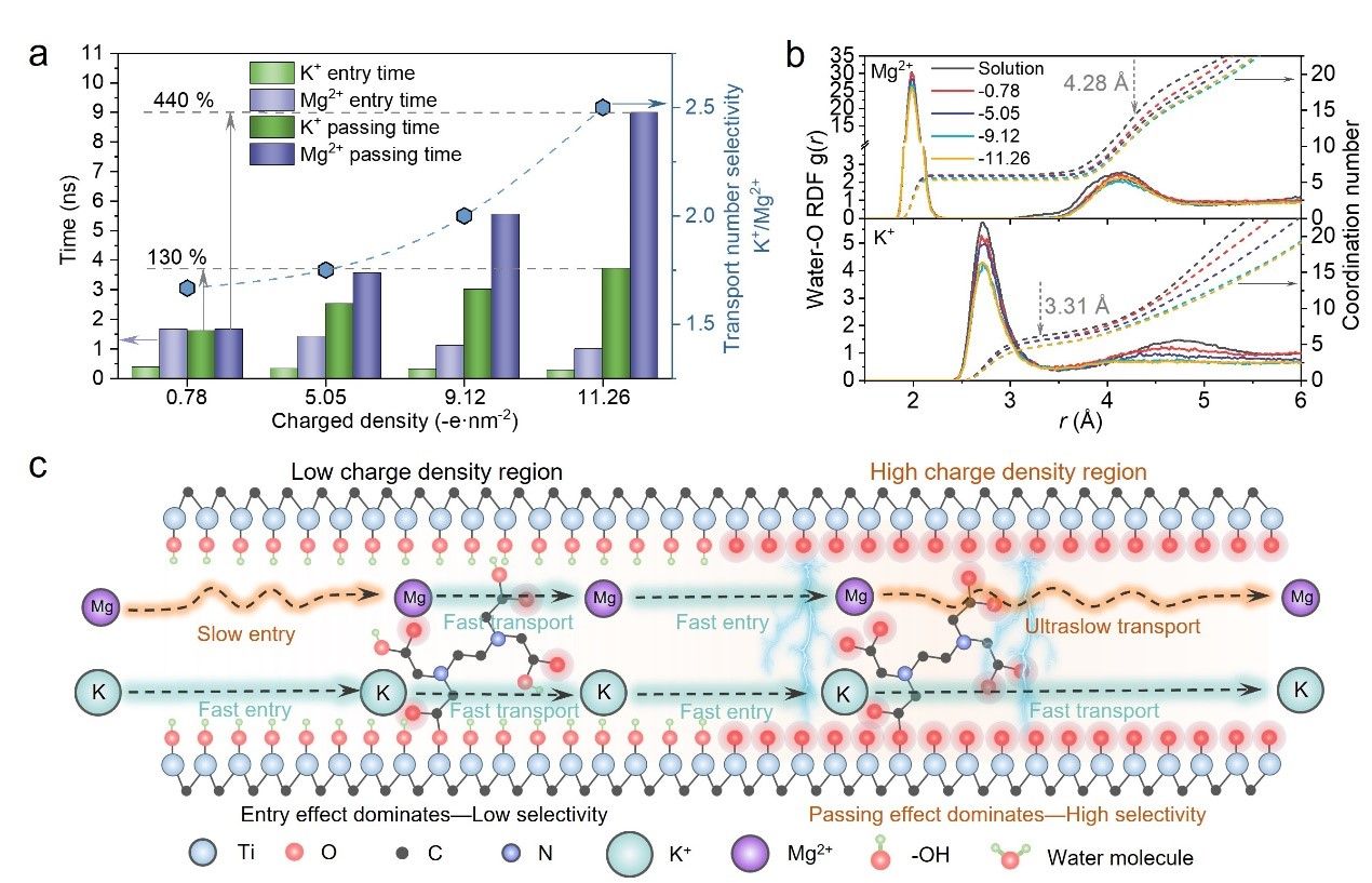 最后,他们对电荷密度调制离子运输的动力学过程进行了解析。结果表明,随着电荷密度的提升,Mg2+运输的限速步骤由进入通道变成了通道内运输,而进入通道这一限速步骤难以带来高离子选择性(图4a)。当电荷密度升高时,离子在通道内运输的差异被逐渐放大,离子的选择性得到进一步提升。与此同时,他们发现离子的脱水效应不仅仅受到通道尺寸的影响,亚纳米通道内电荷密度的增加也会加剧离子的脱水(图4b),这种效应源自于水合离子周围的水分子受到的更强的氢键作用。更大程度脱水之后的Mg2+,由于水分子屏蔽作用的减弱,使其与EDTA分子之间的相互作用更强,更加难以在通道内运输,由此展现出更高的离子跨膜能垒和更低的运输速率。总之,局部电荷密度的增加,会大幅度增长二价离子在通道内的运输时间,因此促进了一/二价离子的分离(图4c)。