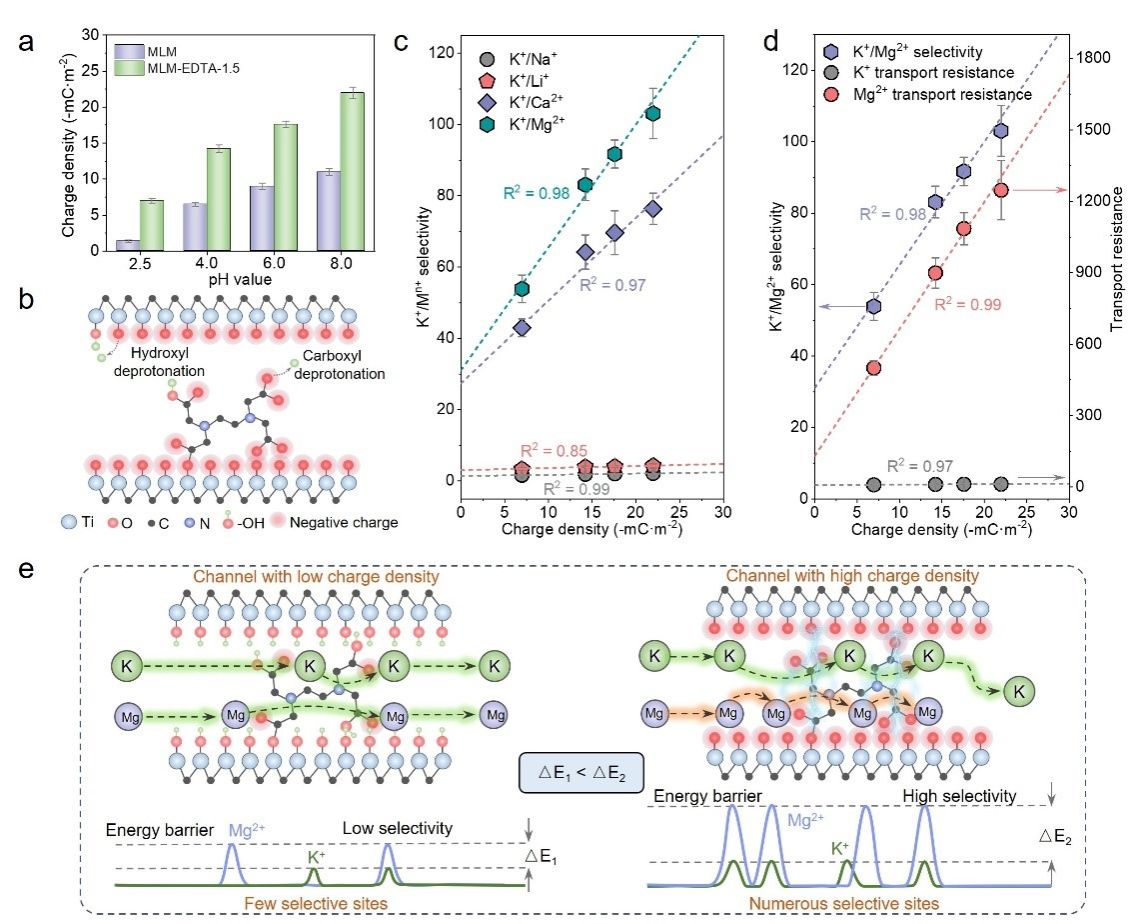 此外,他们还发现电荷密度的增加能显著促进一/二价离子分离的选择性,而且电荷密度的大小和离子选择性之间存在很强的相关性(图3c),而这归因于二价离子跨膜运输阻力的线性增加(图3d)。采用过渡态理论对离子跨膜能垒进行了测试,结果表明随着电荷密度的增加,离子运输的跨膜能垒差异相应放大。通过DFT计算解释了这一现象,EDTA分子脱质子程度的增加使得EDTA分子与两种离子间的亲和力差异被拉大。因此,在高电荷密度下,通道内具有更多且更有效的离子识别位点,因此实现了离子选择性的进一步强化(图3e)。