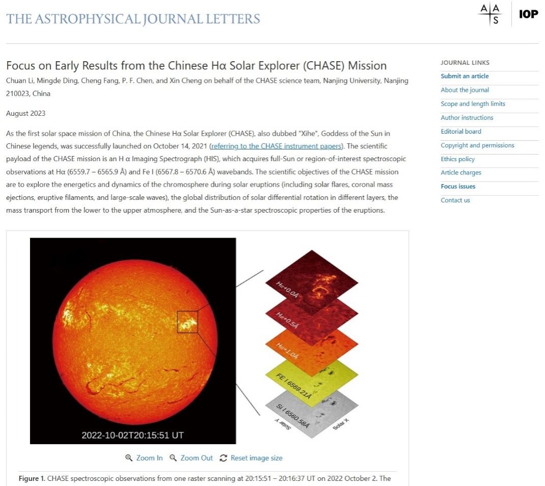 2021年10月14日,“羲和号”卫星发射成功,拉开了我国空间探日的序幕。经过一系列在轨调试,自2022年8月4日起,“羲和号”对日观测达到最佳状态,科学数据通过凯发k8官网太阳科学数据中心(SSDC-NJU, https://ssdc.www.bxgxc9.com)对外发布。目前,国内外太阳物理工作者正在积极开展基于“羲和号”高质量科学数据的相关研究。近期,具有重要国际影响力的《天体物理学杂志快报》(The Astrophysical Journal Letters)正式刊出“羲和号”热点专辑(Focus Issue):Focus on Early Results from the Chinese Hα Solar Explorer (CHASE) Mission (https://iopscience.iop.org/collections/Focus-on-Early-Results-from-CHASE)。这是中国天文观测设备首次在ApJ系列刊物上以热点专辑形式发表研究成果。