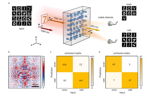 图4 基于频率上转换的手写数字分类。a 上转换光学衍射神经网络对手写数字的奇偶分类示意图。b 非线性全息图相位分布。c-d 分别为数值和实验结果。