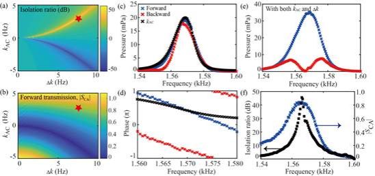 图4 非互易的声能量传输。(a-b)当激发频率设为ω = ωA,动态耦合相位差为Δφ = π/2时,理论计算A、C两腔之间的隔离度和正向传输率|SCA|随静态耦合κAC和动态耦合幅值Δκ的关系。红星标记为实验用耦合参数。(c-d)实验测量只有静态耦合(黑色)或动态耦合时的正向(蓝色)和反向(红色)透射声压和相位差。(e)同时打开动态耦合和静态耦合时正向(蓝色)和反向(红色)的透射声压。(f)显示A、C两腔之间的隔离度达45 dB,正向透射率达0.85。