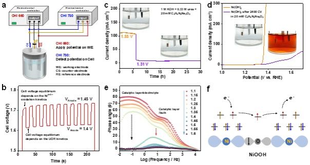 图4. 三价镍直接电荷转移动力学。(a)双化学工作站监测电极反应动力学。(b)当阳极电位在1.45 V和1.4 V之间阶跃时,电池反应动力学。(c)含有丁二酮肟钠盐的电解液中的恒电压反应及实时电解液光学照片。(d)含有丁二酮肟钠盐的电解液中CV循环扫模拟电子转移经由Ni(OH)2/NiOOH氧化-还原过程的电解液光学照片。(e)阻抗谱监测催化层/体相和催化层/电解液界面电子转移动力学。(f)通过Ni3+ (t2g6eg1)未占据的eg轨道进行直接电子转移示意图。