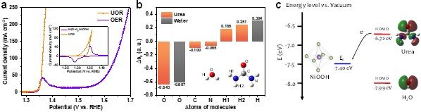 图2. 水氧化和尿素氧化的本质差异。(a)尿素氧化(UOR)和水氧化(OER)极化曲线对比。(b)以尿素和水分子中每个原子的?sk识别亲核原子。(c)尿素和水的HOMO能级和NiOOH的费米能级对比。