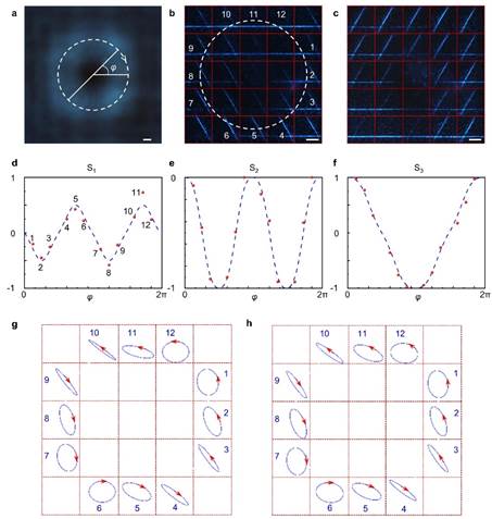 图3. 空间非均匀偏振态的实验测量。(a)空间非均匀偏振光束的强度分布。 (b) (c)在不同圆偏振检偏下的焦面强度分布。(d)-(f) 基于神经网络推算的斯托克斯参量分布,虚线为设计值。(g) 神经网络推算的偏振态分布示意图。 (h) 设计的偏振态分布示意图。