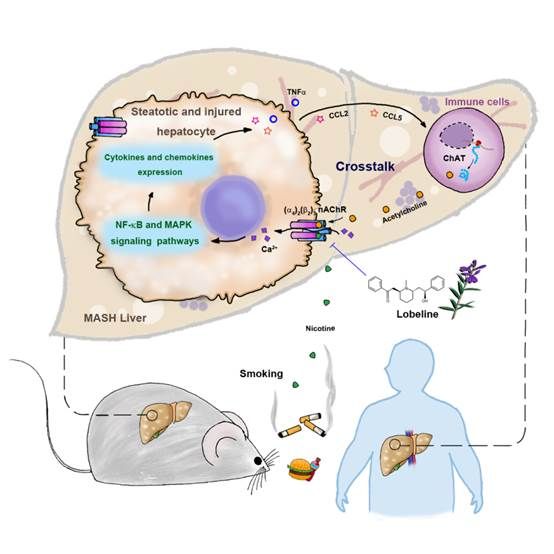 代谢功能障碍相关脂肪性肝病(MASLD)是全球最普遍的肝脏疾病,发病率高达25.2%,其中代谢功能障碍相关脂肪性肝炎(MASH)是MASLD的进一步发展形式。MASH表现为严重的肝细胞损伤和肝脏炎症,部分患者会进一步恶化至肝纤维化、肝硬化及肝癌,而临床上针对MASH有效的治疗方式还非常有限。因此,寻找潜在治疗靶点以及有效的治疗药物具有重大科学意义。烟碱型乙酰胆碱受体(nAChR)属于配体门控型离子通道蛋白,在神经细胞及非神经细胞中广泛表达,但非神经细胞中nAChR的生理病理学功能还鲜为人知。