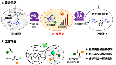 团队对该双催化体系提出了机理假设:在绿光照射下,激发态曙红Y选择性地氧化酶口袋内的Breslow中间体,生成焦磷酸硫胺素结合的稳态自由基,同时氧化还原活性酯类的自由基前体以生物兼容的方式在体系中产生瞬态自由基,从而在酶口袋内发生非天然的酶促自由基-自由基交叉偶联反应。研究团队通过机理湿实验、电子顺磁共振谱学研究和理论计算等方法,对机理开展了详细研究,揭示了新酶反应性的关键以及高立体化学选择性的来源。详细内容请参考原文。