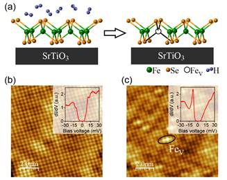 图1:氢辅助在超导FeSe/STO单层中形成铁空位。(a)氢辅助形成铁空位示意图。(b),(c) 超导FeSe/STO单层氢处理前后的原子分辨形貌图;插图为扫描隧道显微谱。