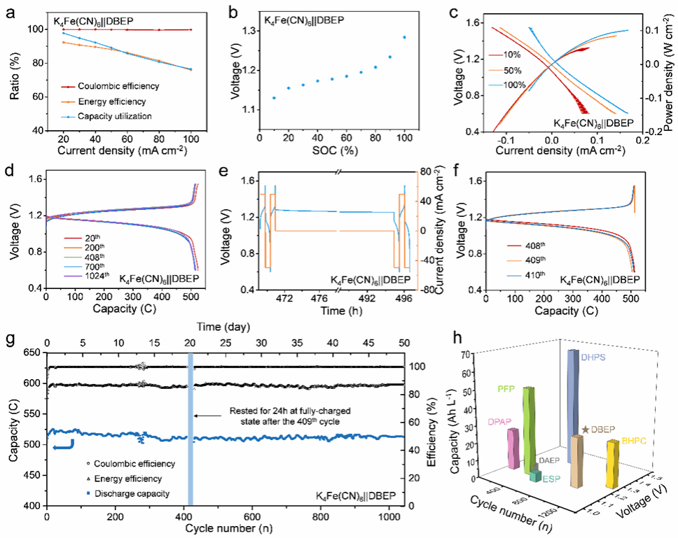为了研究K4Fe(CN)6||DBEP的自放电行为,电池充电至1.55 V后静置24h,开路电压从1.28 V降低至1.25 V,充电容量512.0 C,放电容量降低至504.2 C。在下一个循环周期中,容量恢复至510.1 C。这一结果证明了还原状态下的DBEP在化学和电化学上都是稳定的。K4Fe(CN)6||DBEP ARFB的长期循环性能如图4所示,在pH值为14的408次循环中,放电容量从524.4 C逐渐衰减到512.8 C (469.2 h),容量保持率为97.8%,容量衰减率为0.005% /圈,即0.11% /天。这些结果证明了DBEP分子具有良好的电化学稳定性。因此,作者认为这里的容量衰减主要是由膜电阻和极化的增加引起的。