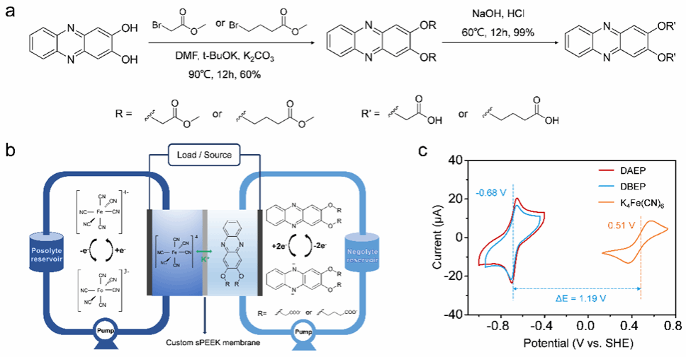 不可再生的矿物燃料的枯竭是一个紧迫的问题,利用风能和太阳能等可再生能源对可持续发展至关重要。将能源储存系统与清洁能源收集系统相结合,对于平衡可再生能源的间歇性并将其纳入电网至关重要。水系氧化还原液流电池(ARFBs)是一种安全实用的电网级储能技术。尽管全钒液流电池因其高功率密度和长循环寿命已实现商业化,但其广泛应用受到钒的高成本的限制。为了解决这一问题,研究人员一直在开发稳定且廉价的基于水溶性有机化合物的ARFBs。其中,吩嗪衍生物由于其相对低的电位、高的溶解度和在碱性溶液中的稳定性而引起了极大的关注。