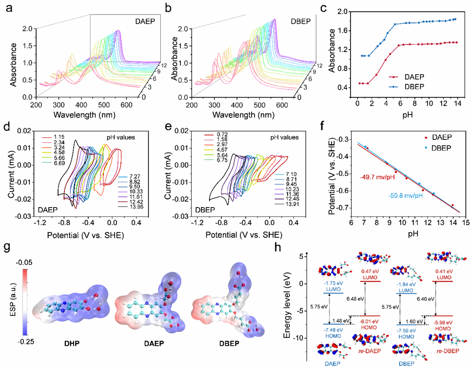 DAEP的pKa值为3.2,而DBEP的pKa值为3.8,对应于两个羧基同时解离。DAEP和DBEP在KOH溶液中的溶解度分别为0.73和0.62 M,明显高于同等条件下DHP的溶解度(1.0 M KOH <0.1 M)。为了进一步研究氧化还原过程中质子和电子的转移行为,作者测试了不同pH值下DAEP和DBEP分子的CV曲线。根据不同pH值下测得的CV曲线计算出的Pourbaix图如图2f所示,计算出DAEP和DBEP的相关斜率分别为-49.7和-50.8 mV pH-1(理论值为-59.2 mV pH-1),符合双电子/双质子过程。