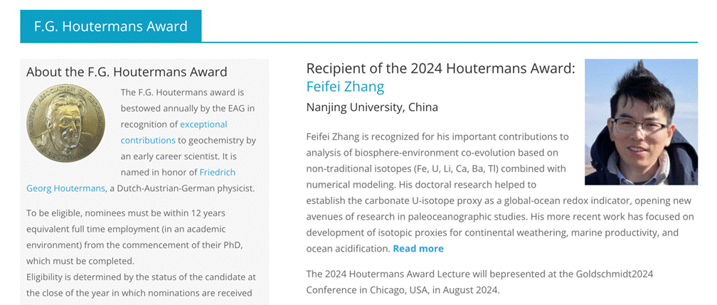 欧洲地球化学学会Houtermans Award官网对张飞飞教授获奖理由介绍
