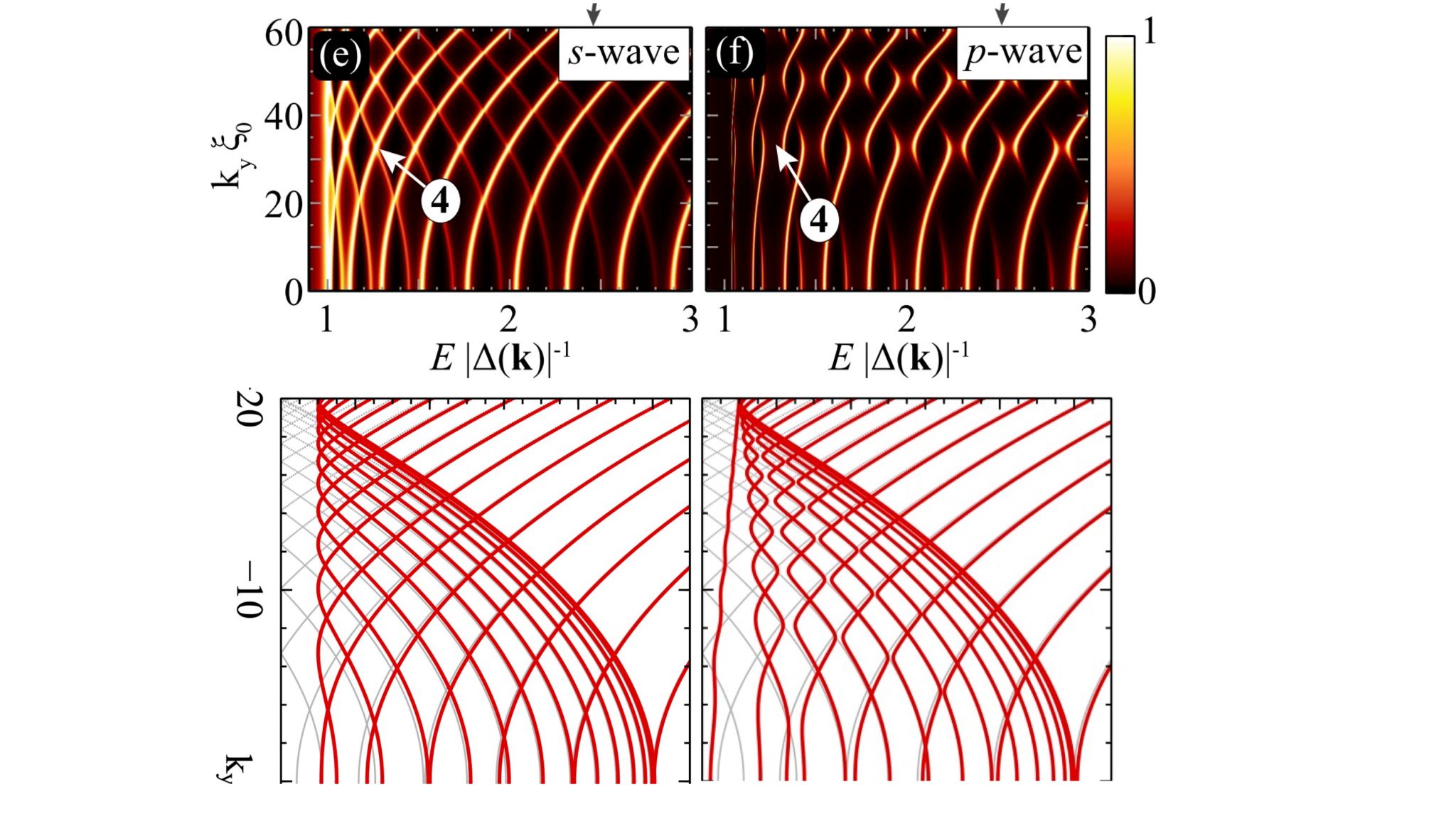 图2:(上)s波和p波超导体透射系数的振荡图样;(下)对应的超导体在开放边界下的束缚态能级。