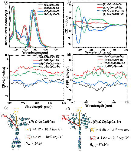 图 2. (a) 归一化的(R)-C-DpCpN-Trz和B-DpCpN-Trz、(R)-C-DpCpCz-Trz和B-DpCpCz-Trz的紫外吸收和荧光光谱;(b) (R/S)-C-DpCpN-Trz和(R/S)-C-DpCpCz-Trz的CD光谱;(c) (R/S)-C-DpCpN-Trz和(R/S)-C-DpCpCz-Trz在甲苯中的CPPL光谱;(d) (R/S)-C-DpCpN-Trz和(R/S)-C-DpCpCz-Trz在掺杂薄膜(3 wt.% mCBP)中的CPPL光谱;(e) (R)-C-DpCpN-Trz和(f) (R)-C-DpCpCz-Trz的理论计算的偶极矩。