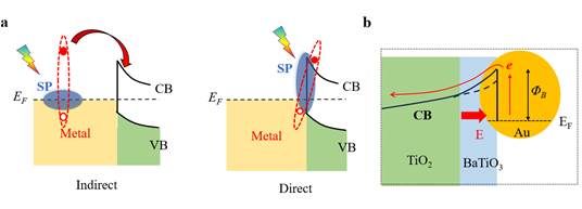 总体而言,虽然直接电子转移机制表现出了比间接电子转移机制更高的电子注入效率,但是,最终电子被提取利用的效率,两者并不会表现出太大的区别。为了提高热电子的利用率,需要设计金属-介质界面,包括设计具有更快电子扩散速度的半导体结构、利用压电材料内在电场(图3)、以及引入外加电场等,以提高界面电子扩散到介质内部、避免与金属中空穴进行复合,最终提高热电子的提取效率。