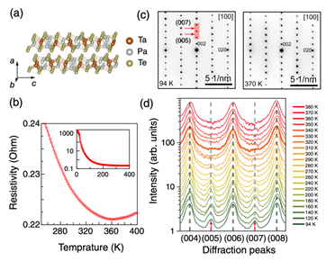 图1: 准一维Ta2Pd3Te5的晶体结构、电阻曲线,以及不同温度下的电子衍射数据