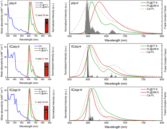 从理论计算模拟中可以看出,MLCT能级过多的参与,激活了参比配合物piq-Ir的低频振动,使得大量的低频振动参与到发射过程中,进而导致较宽的发射光谱。而刚性修饰后的ICziq-Ir和ICzqz-Ir中更多LC能级参与抑制了低频振动耦合到磷光发射过程,使得0-0发射峰明显窄化。其中,ICzqz-Ir对于高频振动的进一步抑制,降低了电子跃迁过程中的高频振动耦合,从而基本消除0-1发射峰。理论计算结果成功解释了铱配合物光谱窄化的内在原理,为设计高色纯度磷光铱配合物提供了理论基础。