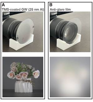 基于这个原理,可以实现独特的伪装摄像。图2展示了一个对比实验。这里我们将一个超低透射率的透明哑光表面样品贴在照相机镜头上。此样品的透射率仅为3%左右,总反射率约80%,但镜面反射率在全可见光波段仍然保持为~1%(实验测量结果)。由于这个样品是微纳铝片组成的,其外貌类似于哑光的普通铝片,对相机镜头有覆盖伪装功能。有趣的是,尽管透射率只有3%,相机镜头仍然能够拍摄出清晰的照片(图2A下图)。作为对比,采用防眩光膜遮挡相机镜头时,可以清晰地看到后面的镜头,这是因为防眩光膜的透射率很高。尽管透射率这么高,相机镜头拍摄的景物照片却非常模糊(图2B下图)。这说明防眩光膜中的漫散射严重地破坏了透明性,使相机丧失了拍摄功能。相反,透明哑光表面则在实现哑光外貌的同时完美保护了透明性,从而实现了对透明材料的伪装。