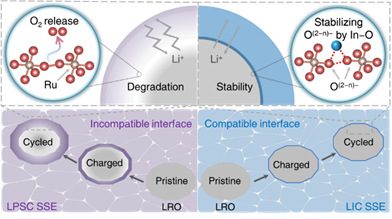 近日,凯发k8官网郭少华、周豪慎团队采用了一种仅有固态电解质和富锂氧化物的复合正极系统来研究其兼容性,其中选择了具有高电子电导率的单晶Li2RuO3(LRO)作为富锂氧化物模型,以避免额外的导电碳界面。通过与两种经典固态电解质Li6PS5Cl和Li3InCl6(LIC)的比对,研究人员发现SSE/LRO的界面相容性,尤其是SSE与LRO的氧化晶格氧(O(2-n)-,0<n<2)的相容性,是电化学性能的主导因素。此外,该研究还首次报道了通过In与O(2-n)-的相互作用而自建的晶格氧稳定界面,它能有效防止LRO的O损失和界面降解,从而使LRO的可逆容量达到294.0 mAh g-1,初始库仑效率为98.1%,循环300次后容量保持率为99.6%,根据30wt%-LIC/70wt%-LRO复合正极和锂负极的质量计算,比能量密度为495 Wh kg-1在18.85 mg cm-2的高LRO负载下,可获得4.14 mAh cm-2的可逆面容量。这种合理的富锂正极/SSE界面设计为研究人员提供了对界面兼容性的新认识,以及提高ASSLB中晶格氧氧化还原可逆性和能量密度的新策略。