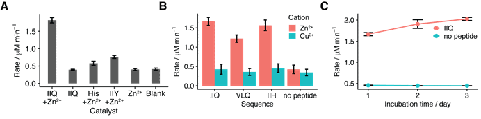随后,研究者进行了一系列实验以验证在金属离子存在的条件下,自组装多肽在室温下是否确实具备催化硅烷产氢的能力。结果显示,与单独的多肽、组氨酸或金属离子相比,自组装多肽在存在金属离子的情况下显著展现出催化活性(图3A)。这表明多肽自组体与金属离子形成了特定的催化活性中心,验证了理论预测的结果。此外,实验结果还表明,催化性能受多肽序列和金属离子类型的影响(图3B)。另外,研究者还观察到多肽分子自组装的孵化时间对催化性能有显著影响(图3C),这进一步强调了组装结构与催化活性之间的直接关联。