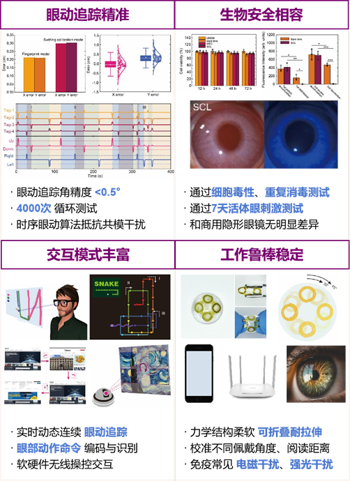 眼动追踪隐形眼镜由四个无线射频位置标签构成,分布于隐形眼镜的四周并封装在医疗级硅橡胶材质内。其具有和人眼角膜相匹配的曲率,表面亲水化改性和极薄的厚度使其水润透氧、舒适无感。用户佩戴隐形眼镜之后,通过简单的隐式校准过程,定标人眼眼球个体差异和佩戴过程中的随机性,基于时序眼动追踪算法实现高精度的眼动追踪。眼动角精度优于0.5°,甚至小于中央凹所提供的视角,满足眼动追踪的精度要求。隐形眼镜工作过程中鲁棒稳定,无线射频的技术方案免疫强光、投影图像对眼动追踪的干扰。器件的工作频率也规避了常见的电磁干扰,例如手机、路由器等射频信号源。此外,隐形眼镜的生物相容性封装保证了器件的安全性,通过72小时细胞毒性测试以及长达一周的长期活体兔眼刺激测试,和商用隐形眼镜无明显差异。基于该隐形眼镜,联合团队展示了丰富多样的眼机交互应用,例如眼动文字输入、绘画、游戏操控、网页交互、摄像头操控、无人车操控等。凭借该隐形眼镜准确稳定的无线眼动追踪能力、丰富多样的交互模式、柔软舒适的结构特性以及生物安全的理化性质,其有望在人机交互、眼脑医学诊疗、眼-脑科学研究、心理学研究等领域展开应用。