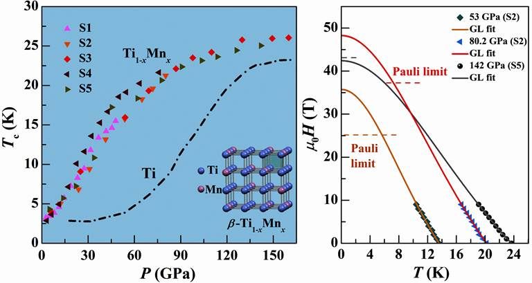 图1. 左图为Ti1-xMnx合金压力下的超导相图(上面不同的实心点),插图为β相晶体结构示意图;右图为上临界磁场及其拟合结果,以及超越泡利极限的情况。