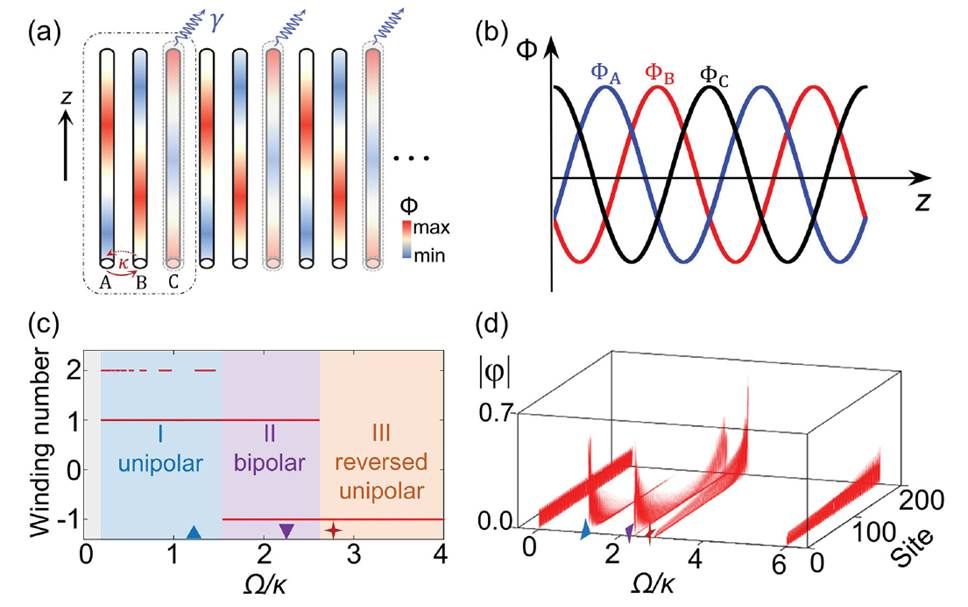 在本工作中,研究人员考虑了有效折射率实部沿传播方向变化的波导阵列,如图1(a,b)所示,其中一个原胞中有三根波导(A, B, C),C波导中存在损耗。这种有效折射率调制在规范变换后可以等效为一种规范场,为波导之间的耦合提供了等效的相位因子。通过Floquet理论求解该体系并计算其复空间能谱的卷绕数,可以发现其随着调制频率的变化,体系中存在三种非厄米拓扑相,分别为I. 单极 (unipolar),II. 双极 (bipolar) 和III. 反向单极相 (reversed unipolar),如图1(c)所示。这些相中对应的开链 (OBC) 的本征态分布如图1(d)所示,可以看到随着调制频率的增大,体系的本征态从堆积在左边界,到堆积两个边界,再堆积到右边界上,这非常直观地展示了不同的非厄米相的本征属性。