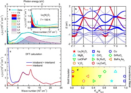 图1 (a) La3Ni2O7的光电导谱(T = 150 K)和Drude-Lorentz拟合结果,插图将低频的结果进行了放大。(b)和(c) 计算得到的La3Ni2O7的能带结构和光电导谱。(d) La3Ni2O7和一些其它典型材料的电子动能比Kexp/Kband。