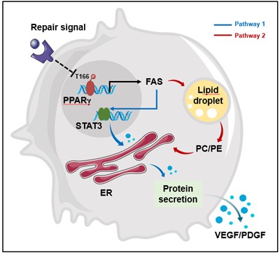 为探讨M2c巨噬细胞在功能调控中的分子基础,本项目研究人员首先利用多种组织损伤中巨噬细胞的单细胞RNA测序(scRNA-seq)数据构建了M2c巨噬细胞Atlas,结果显示:M2c巨噬细胞中脂肪酸合成(FAS)活性持续增强,且主要与组织修复功能密切相关,据此初步建立了脂质生物合成与巨噬细胞极化为M2c表型之间的关联性;其后,研究者构建皮肤全层切除、急性肝脏损伤和肌肉损伤等多种动物模型,并结合细胞与分子免疫学实验、多组学联合分析,对M2c巨噬细胞极化过程中的关键代谢调控节点进行了深入细致的剖析,建立了以PPARg T166磷酸化为核心节点的巨噬细胞FAS功能调控网络。具体为:在受损组织中,修复信号导致巨噬细胞PPARγ T166磷酸化水平降低,从而促进PPARγ与FAS相关基因调节区域结合,最终诱导胞内脂质的生成与积累。细胞中新生脂质可诱导STAT3介导的血小板衍生生长因子(PDGF)、转化生长因子-b(TGF- b)和血管内皮生长因子(VEGF)等产生,以促进血管新生和再上皮化过程。另一方面,新生脂质可合成磷脂以支持内质网扩张,进而为修复蛋白分泌提供胞内支持。在此过程中,运用遗传或小分子抑制PPARg T166磷酸化的手段,可显著促进巨噬细胞的修复功能,进而影响组织再生进程。综上,该研究确定了以PPARg T166磷酸化修饰为核心的代谢重塑是修复型巨噬细胞功能发挥的关键途径。