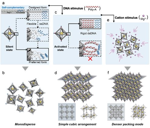 这项工作中设计的一元体系以八面体形状的DNA折纸框架作为主要结构单元,顶点延伸出的全同DNA粘性末端作为表面官能团。所有DNA粘性末端由两部分组成:自互补连接功能区和作为spacer分隔折纸框架和功能区的poly-T序列。由于单链DNA的persistence length仅为1 nm左右,因此在单体合成阶段,同一顶点内的粘性末端将会发生自聚集现象,阻止构建块的进一步组装。当以poly-A序列作为DNA刺激与spacer区域结合时,由于双链DNA的persistence length为~50 nm,粘性末端区域的刚性将会得到显著增强,从而可以有效防止功能区的相互结合,激活该一元体系在不同维度下的组装过程。另外,这项工作还引入了高浓度的镁离子作为化学刺激来触发晶体的相变过程。实验中发现,随着镁离子浓度的不断升高,单体的堆积模式会随之发生改变,体系也随之经历从简单立方相到面心立方相的相变过程。