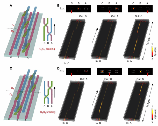 图2. 在三层集成硅波导中利用绝热捷径策略实现快速编织效应。
