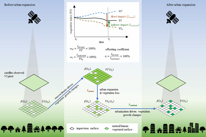 全球城市化率已达57%,到2050年,城市人口预计将再增加约25亿。作为城市气候与生态环境的重要调节器,植被在缓解高温、净化空气、改善居民生活质量等方面发挥着重要作用,在城市化发展过程中,城市植被的重要性日益凸显。在气候变化与城市化快速发展的背景下,一方面城市化会导致原本的植被覆盖区域转变为建筑物、道路等不透水面,从而造成大量的植被损失(直接影响);另一方面,城市环境变化及人为管理等因素又会促进城市中植被的生长(间接影响)。尽管一些研究已通过城乡间植被覆盖与绿度对比,研究了城市环境对植被生长的直接与间接影响,但城市化发展进程对全球城市植被变化趋势有何影响以及未来城市植被将如何变化目前仍不清楚。