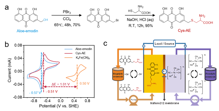 图1. Cys-AE 的合成路径与 Cys-AE | | K?Fe(CN)? 水系有机液流电池的示意图。