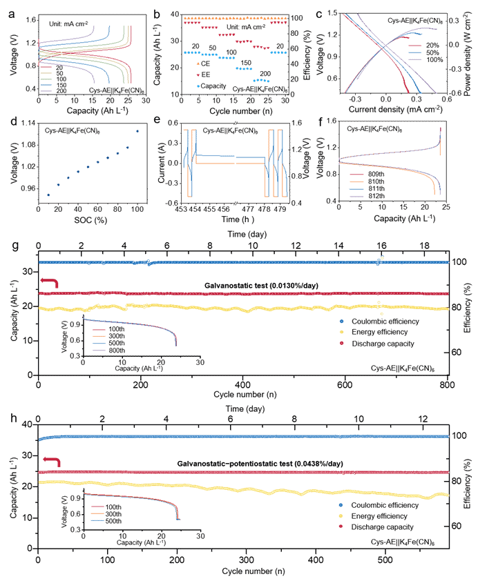 3. Cys-AE||K?Fe(CN)?构建的液流电池在不同浓度下的长循环性能