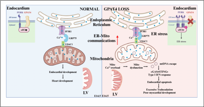 澳大利亚南威尔士大学杨洪远与河北医科大学高明明实验室制作了甘油三酯合成的限速酶之一甘油-3-磷酸酰基转移酶4(GPAT4)的全身敲除小鼠,发现胚胎致死及心脏发育异常。他们与凯发k8官网医学院杨中州团队开展合作研究,探讨GPAT4调控心脏发育的机制。为此,杨中州团队培育出了内皮细胞敲除(Tie2-Cre介导)及心内膜细胞敲除(Nfatc1-Cre介导)Gpat4的小鼠,发现GPAT4功能缺失导致心内膜发育异常并进而影响到心肌发育,明确了GPAT4对心内膜发育的特异调控功能。之后,他们利用全身及内皮细胞敲除小鼠的心脏组织,进行基因表达谱分析,发现cGAS-STING及一型干扰素反应通路被激活,该通路的过度激活会引发细胞凋亡。进而,他们发现心内膜细胞GPAT4功能缺失导致内质网应激,引起内质网-线粒体接触及通讯增加,钙离子由内质网进入线粒体,导致线粒体钙超载,线粒体被破坏,其中的DNA逃逸至线粒体外,激活cGAS-STING及一型干扰素反应,最终导致心内膜发育受损,心肌小梁致密化出现障碍,心肌及心脏发育出现异常,导致胚胎致死。