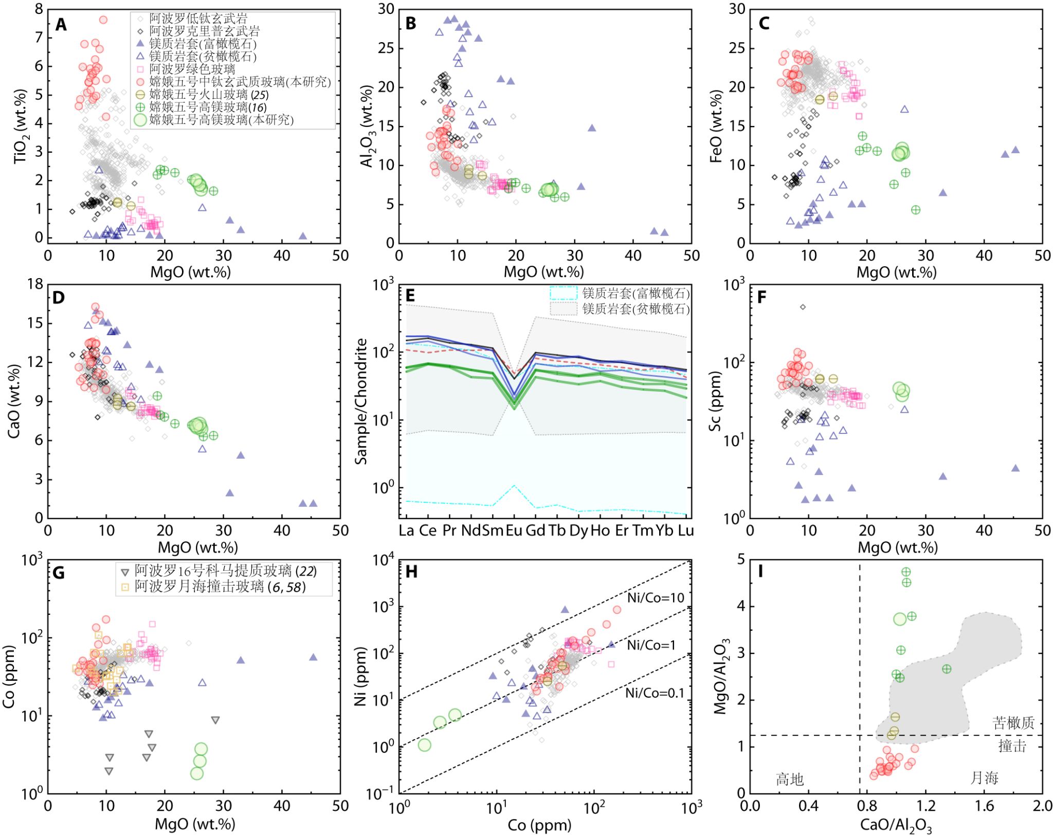 图2. 高镁玻璃G1-GB-1的化学组成。(A–D) 主量元素与MgO的二元图解。(E)高镁玻璃(绿色实线),中钛玄武质玻璃的平均(红色虚线)和嫦娥五号火山玻璃珠(蓝色实线)的稀土元素球粒陨石归一化模式图。(F–G) 部分微量元素与MgO的二元图解。(H) Co和Ni含量的二元图解。(I) CaO/Al2O3比和MgO/Al2O3比的二元图解,区分火山成因和撞击成因玻璃珠。灰色阴影区域为阿波罗样品中的火山玻璃珠。