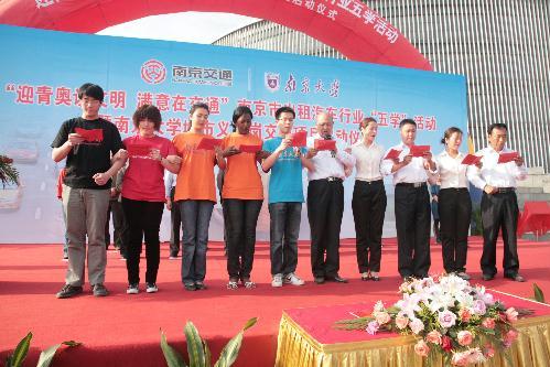 4月20日,我校团委城市义工岗交通服务项目暨“迎青奥讲文明,满意在交通”凯发k8官网市出租汽车行业“五学”活动在仙林校区启动。凯发k8官网市委常委、宣传部长许慧玲,凯发k8官网党委常委、副校长闵铁军,团市委书记单晓峰等出席了会议,凯发k8官网、凯发k8官网市交通局、凯发k8官网市文明办等相关单位负责人,凯发k8官网市出租车驾驶员代表、我校青年志愿者代表和媒体代表300余人参加了启动仪式。