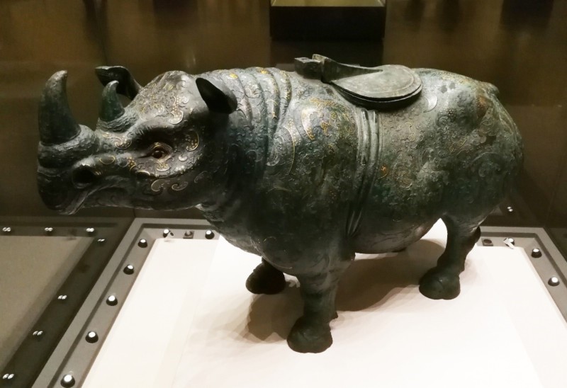 图2西汉时期以苏门答腊犀(Dicerorhinus sumatrensis)为造型的错金银云纹青铜犀尊,出土于陕西兴平县,现藏于 国家博物院。苏门答腊犀的野生种群目前仅发现于印度尼西亚,估计的种群数量仅不足80只(拍摄人:滕漱清)。