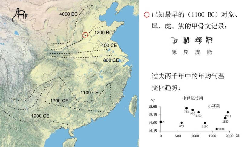 图1 历史重建数据表明,过去两千年以来亚洲象(Elephas maximus)在我国大陆地区的主要分布区持续向南萎缩,其分布格局变迁与年均温动态具有明显差异,而与汉文化的空间扩展表现出显著的关联关系。