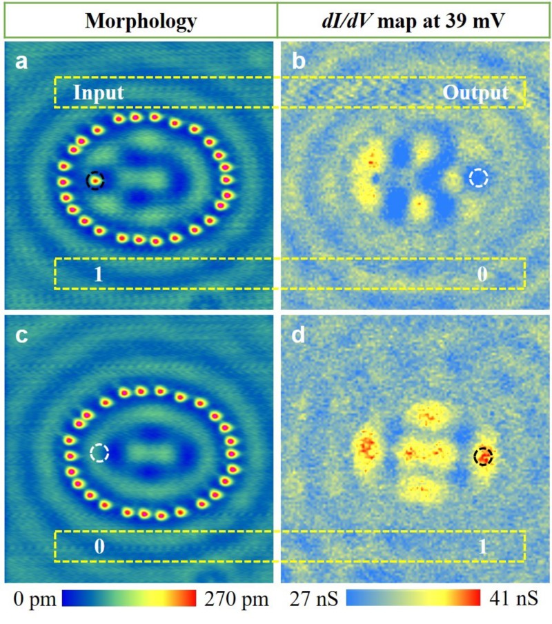 结合系统的实验探究和解析模型,该研究揭示了量子海市蜃楼的形成机制,表明量子海市蜃楼是由椭圆量子围栏的一个没有放置原子的焦点的电子波函数与经过围栏和放置在另一焦点处的原子反射回来的波函数相干叠加的结果。在此基础上还进一步通过对量子海市蜃楼的精密调控实现了基本逻辑操纵,如逻辑非门,扇出门和或门等。图1展示了逻辑非门。与量子海市蜃楼中利用量子相干叠加中相干增强的原理不同,逻辑非门的设计是基于量子相干叠加中的相干相消。当在椭圆的左焦点中放置原子时(输入为“1”,形貌图如图1a所示),相干相消使得输出的信号(如图1b所示,右焦点的dI/dV强度)减弱,形成信号为“0”的输出,而当左焦点处未放置原子时(输入为“0”,形貌图如图1c所示),形成信号为“1”的输出(如图1d所示),从而形成逻辑非门。