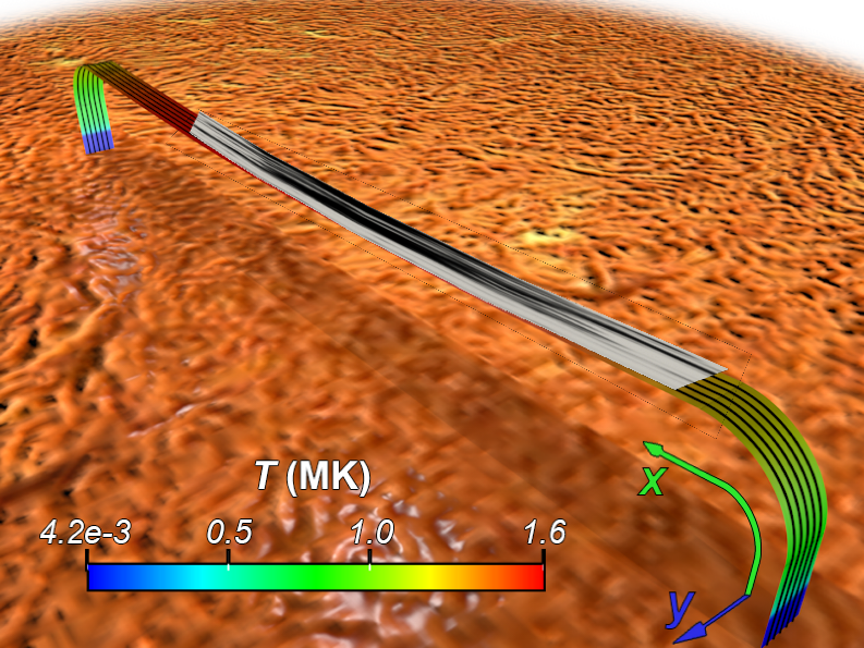 为了解决这些问题,课题组提出一个设想:太阳表面的湍流运动提供了一个随机加热作用,正是这些随机加热导致太阳表面物质向日冕的蒸发过程出现不均匀性,从而产生日珥的细丝结构;也正是这些随机加热导致已形成的日珥细丝总是处在随机扰动之中,从而表现出忽左忽右的运动。基于这个想法,课题组利用凯发k8官网超级计算中心的机群对日珥的形成进行了数值模拟,再现了日珥细丝的精细结构及其交替反方向运动特征,如下图所示。对于国际上关于日珥细丝是否示踪当地磁力线的争论,该工作证实细丝的走向与当地磁力线基本一致。更为重要的是,该工作预言:在大量冷的日珥细丝之间的高温物质中也时刻存在交替方向的流动。