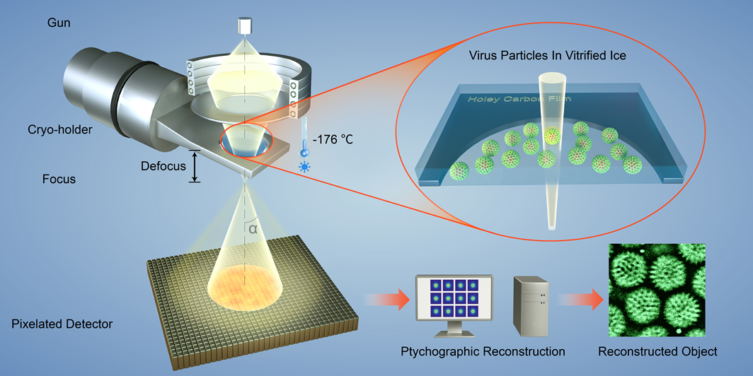 本研究工作首次实现了低电子剂量条件下冷冻生物样品的电子衍射叠层成像(Cryo-Ptychography),从理论上揭示该方法具备更宽的信息传输频域带宽,并从实验上展示了低电子剂量条件下双层轮状病毒颗粒(DLPs)以及类艾滋病毒颗粒(HIV-1)的高衬度相位成像以及常温条件下腺病毒感染细胞切片微米级大区域的成像。为结构生物学研究中蛋白结构的高分辨、高衬度和高信噪比成像表征提供一个崭新的技术思路和手段。