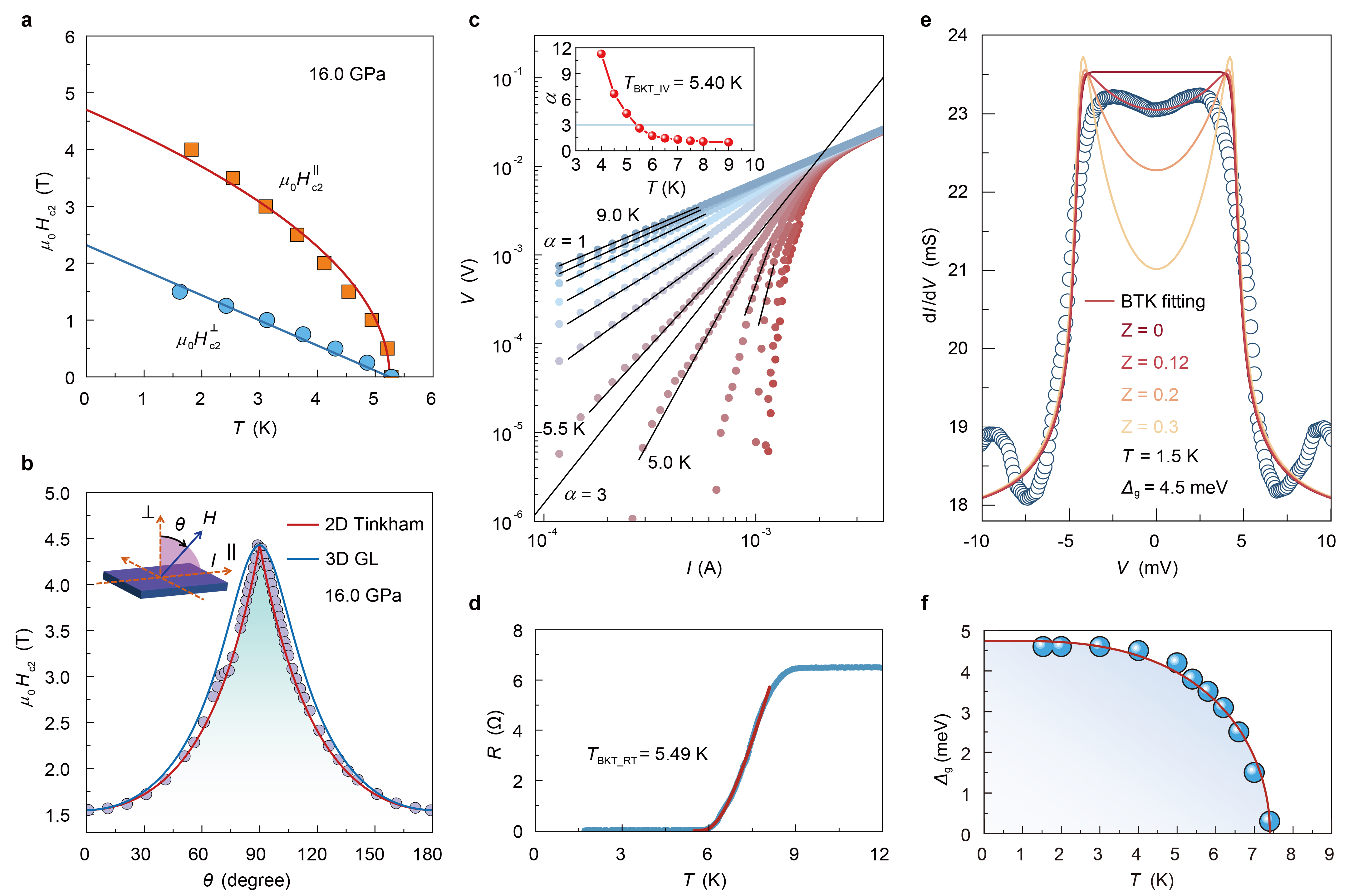 图3. 加压下GeP薄层样品中的准二维超导电性和安德烈夫(Andreev)反射谱。(a)面间和面内上临界磁场的温度依赖性。(b)上临界磁场角度依赖性。(c)变温电流–电压曲线的BKT转变分析。(d)超导转变电阻曲线的BKT拟合。(e)基于GeP/石墨异质结的高压Andreev反射。(f)超导能隙的温度依赖性。
