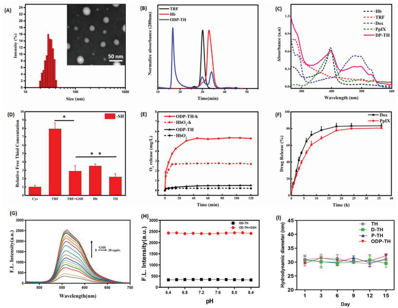 图2.ODP-TH药物纳米递送平台的理化性质。(A)ODP-TH的粒径分布及透射电镜照片。(B)TH纳米外壳的排阻色谱(SEC)图。(C)Hb、TRF、Dox、PpIX和DP-TH的紫外吸收光谱图(UV–vis)。(D)不同组别间游离巯基浓度的比较统计图。(E)不同组别间氧气释放曲线统计图。(F)ODP-TH在 GSH(5 mm)作用下不同时间的药物释放曲线。(G)Dox的释放和GSH浓度的依赖关系。(H)pH值的变化对药物释放的影响。(I)TH、D-TH、P-TH 和ODP-TH 其水合粒径与时间依赖图。