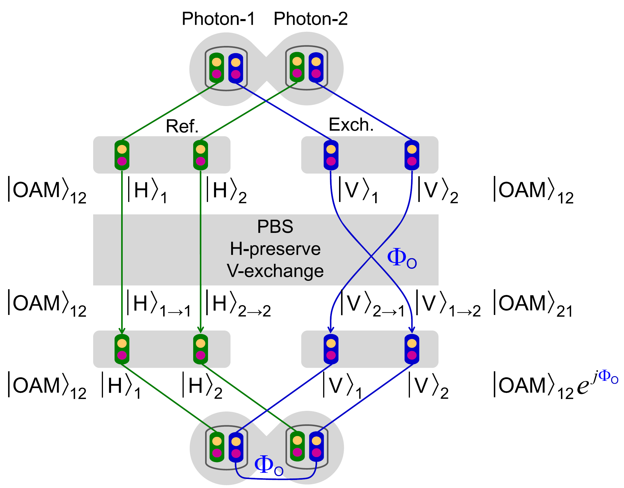 图3. 直接测量轨道角动量粒子交换位相原理图。借助于超纠缠Bell态双光子干涉,通过引入偏振作为辅助自由度将轨道角动量双光子交换位相转换为偏振的内部位相。